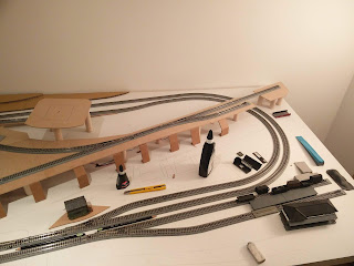 Not too much more to show at the moment. I've been adding cardboard supports for the hills that I will eventually be creating using plaster cloth. I added another small platform in the middle of the layout that will provide the base for a pagoda building, but it's not going to hold any track on it.